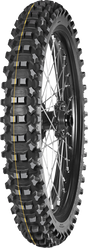 The Terra Force-EX MH features refinements in tread, carcass and profile design, with a well spaced, aggressive knob design (17 mm) that contributes to great traction and control on medium to hard pack soil, Identified by the characteristic yellow stripe is ideal for higher speed, higher mileage or heavy load use (i.e. - hare scrambles, desert racing), The reinforced carcass and a flexible sidewall helps it to absorb impacts and ensure maximum traction and directional stability, Medium carcass construction and compound, especially designed for high speed enduro, ideal in hard dry conditions, The side knobs with a hooked profile aid acceleration, Tread designed for optimum performance in medium to hard terrain, Competition tire for use on enduro & dual sport motorcycles (20/80 road to dirt dual sport application)