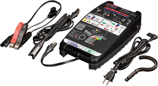 DUO technology for both 12 V lead-acid and 12.8 V lithium batteries, Push button BMS (Battery Management System) reset, Smart recovery mode for deep discharged batteries, Power supply function to use while tuning or running diagnostic with engine off, Automatic fast new battery activation, Battery test indication, Includes OptiMate HOOK
