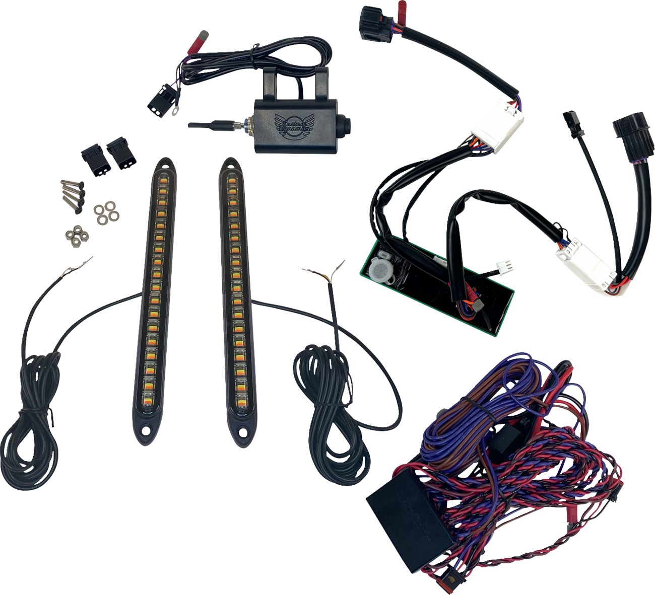 Adds front white running lights and amber front turn signals, 4-way hazard function, 10 user selectable brake flash/strobe patterns, All components are equipped with watertight quick connectors to make installation simple and easy , Plug-and-Play installation, Kit includes:, Amber/white front turn signals strips with white running light and amber turn signal (part # 2020-2148), Turn signal flasher module (part # 2050-0449), Low profile turn signal switch (part # 2106-0582), SMART Triple Play? run, brake, turn conversion module to convert rear OEM taillights to run, brake and turn signals