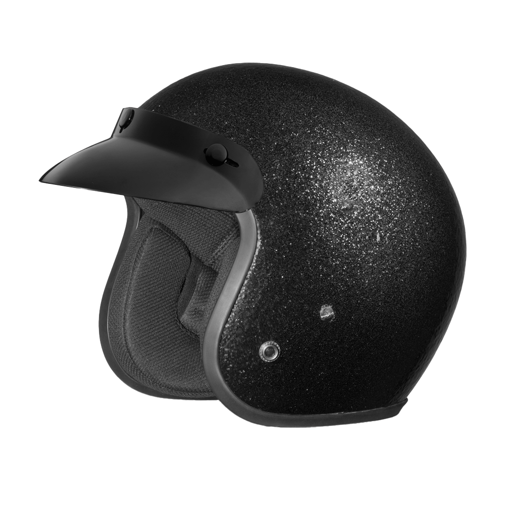 Our D.O.T. Daytona Cruiser 3/4 Shell Helmet In The Black Metal Flake, Meets And Exceeds D.O.T. FMVSS 218 Standards And Is The Smallest D.O.T. 3/4 Shell Helmet Ever Made!!  With 3 Different Shell Sizes, You're Sure To Get That Proportionate Fit!!  Available Only With Removable, Snap On Gloss Black Bubble Visor.  Many More Colors And Designs Available Such As Soft Touch Dull Black, Hi-Gloss Black And Hi-Gloss White; Custom Colors: Gun Metal Grey Metallic; Specialty Items: Graphics.  Head Wrap And Cloth Draw String Bag Included.  Sizes Range From XS-2XL.