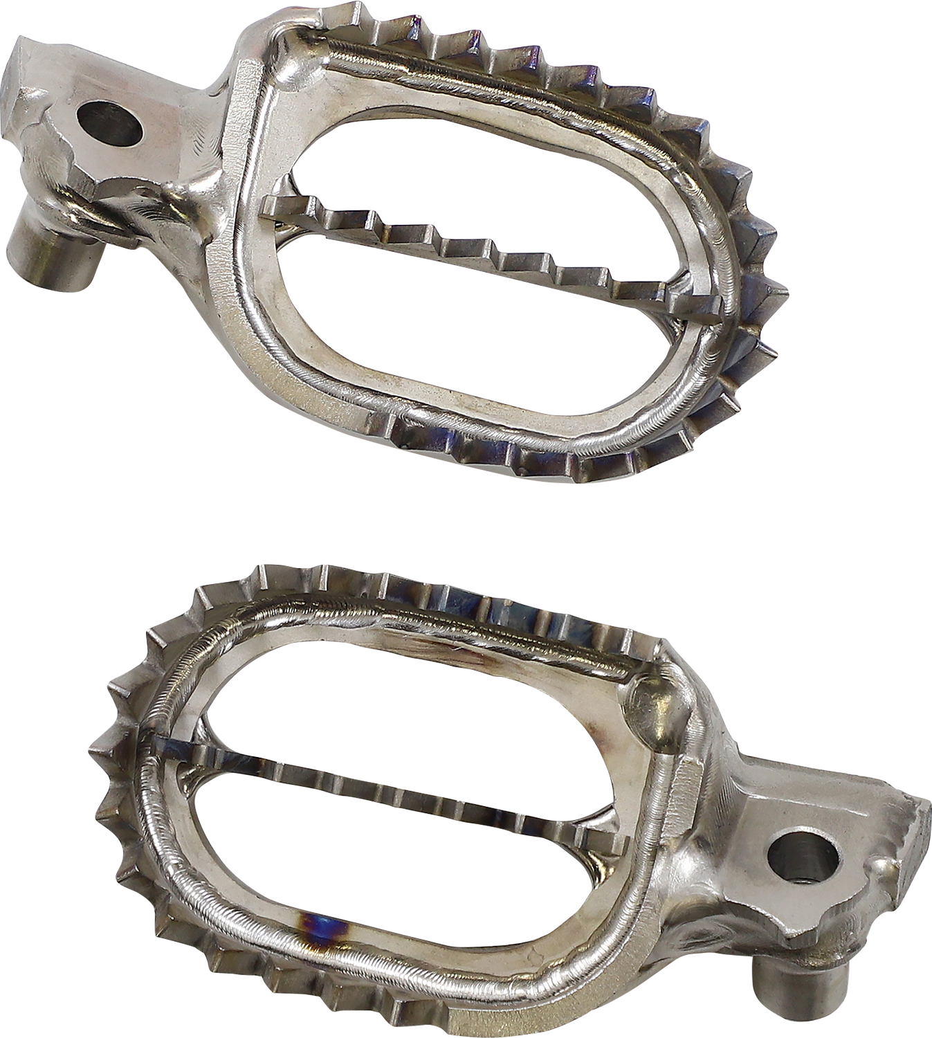 Made from aerospace-grade titanium Grade 5 Ti-6AL-4V with chamber-controlled welding, 57 mm cleated platform provides ample surface area and support for the most aggressive riding, Super lightweight coming in under 300 grams per set, Inner cleated webbing design provides added traction surface and strength to the foot pegs, Beveled front and rear edge, prevents pegs from hanging up in deep ruts