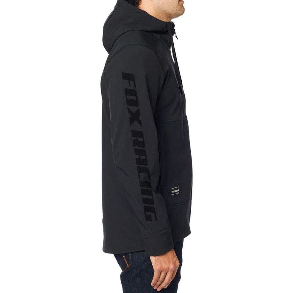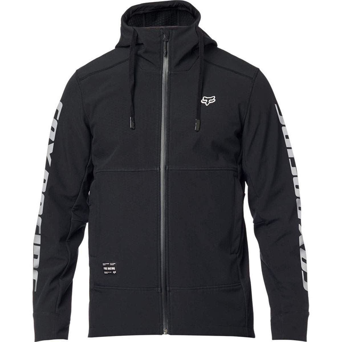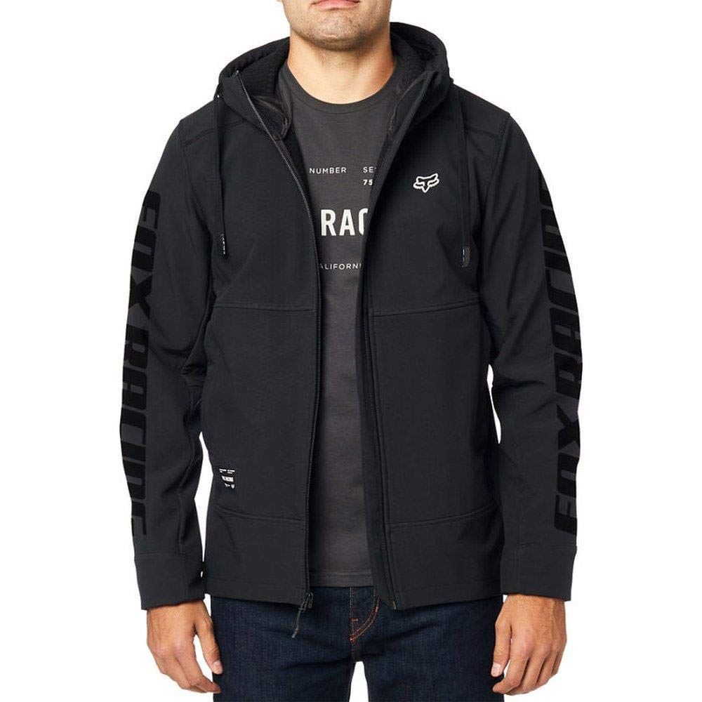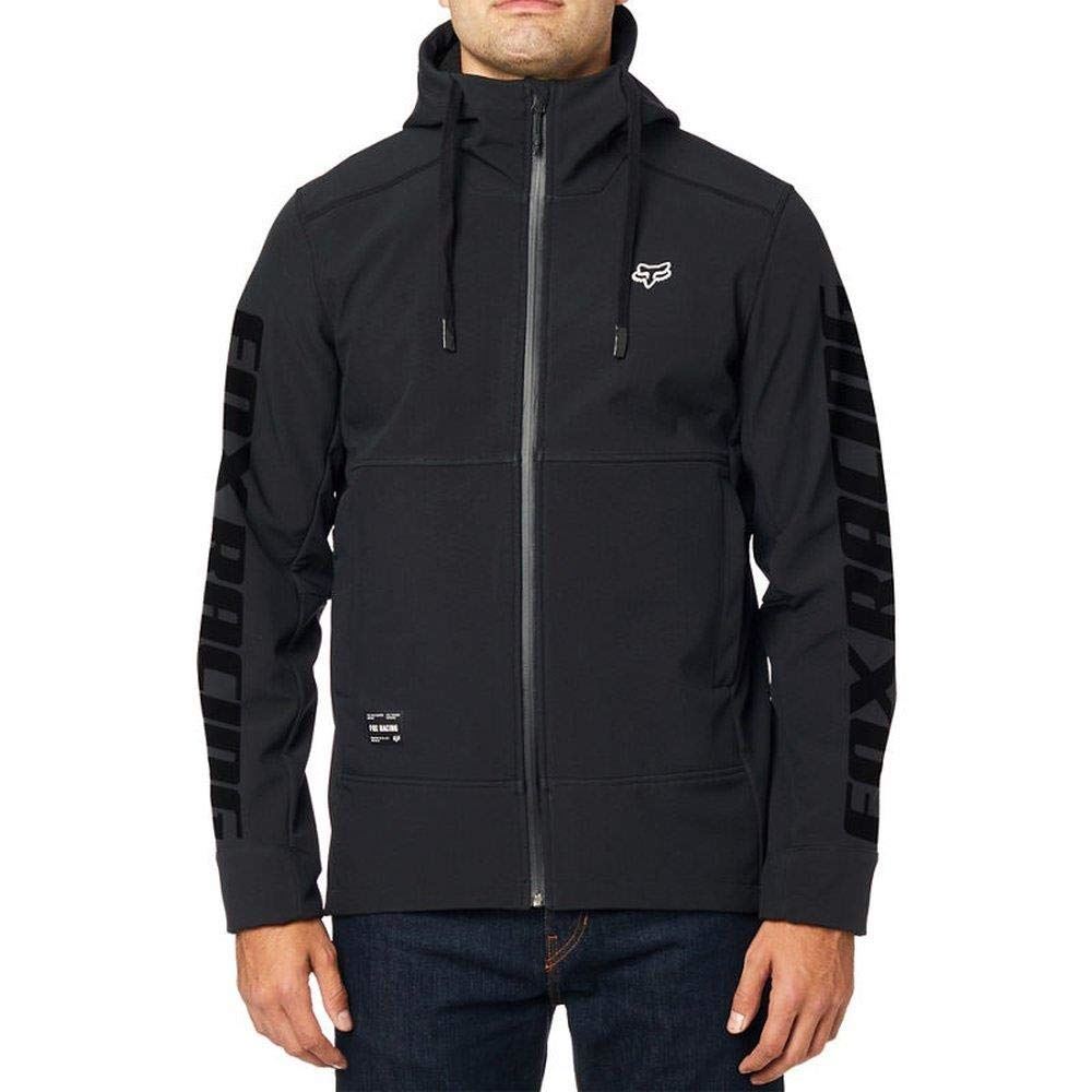 Versatile mid weight soft-shell perfect for cold weather conditions. Silicone Fox Racing heat transfer at chest. Exterior heat transfer label at lower front. Matte finish water proof center front zipper. Fox Racing screen print at sleeves.