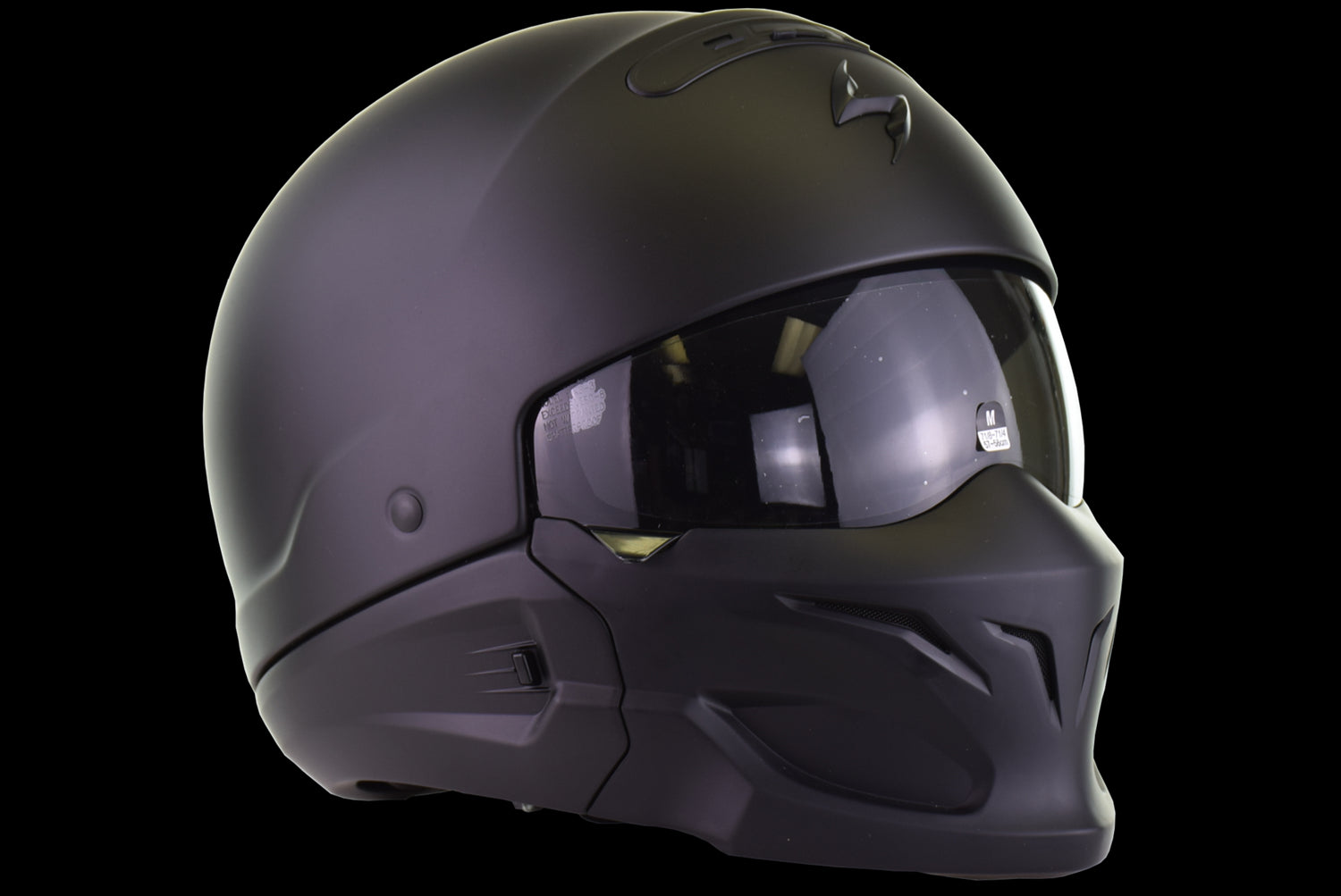 Meant to disrupt the norm, this radical design can be converted to work with any type of bike. We started with a half helmet and added an integrated drop-down sun visor for protection from sunlight. A rear comfort sleeve allows you to convert the helmet to a ? open-face and then attach the included front mask and you?ve got one, aggressive looking full face helmet.