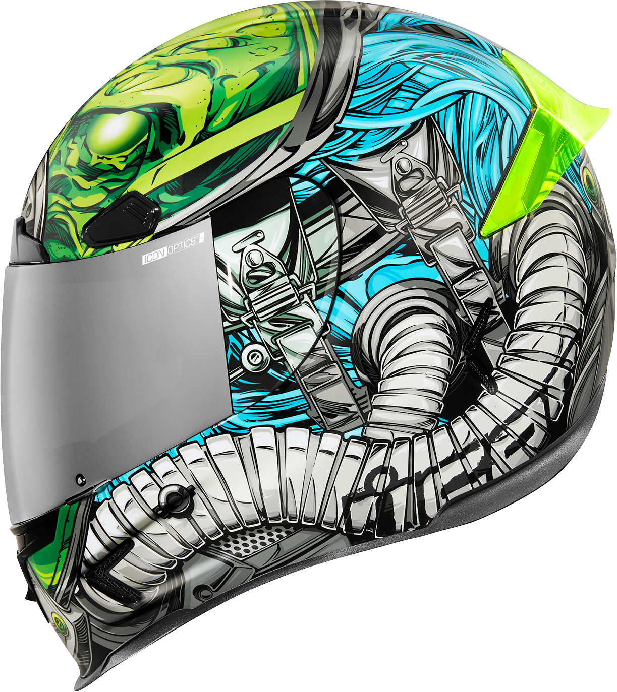 Low-profile vents throughout the shell, Sculpted neck roll reduces jacket/suit interference, Fog-free ICON Optics* Shield with Rapid-Release* system, Linear ported forehead vents, Prolock* positive shield locking system, Five-piece modular liner with moisture-wicking Hydradry*, Removable breath deflector and chin curtain, Handcrafted composite fiberglass FRP (fiber-reinforced plastic) shell, Includes Clear & RST Silver ICON Optics* Shield