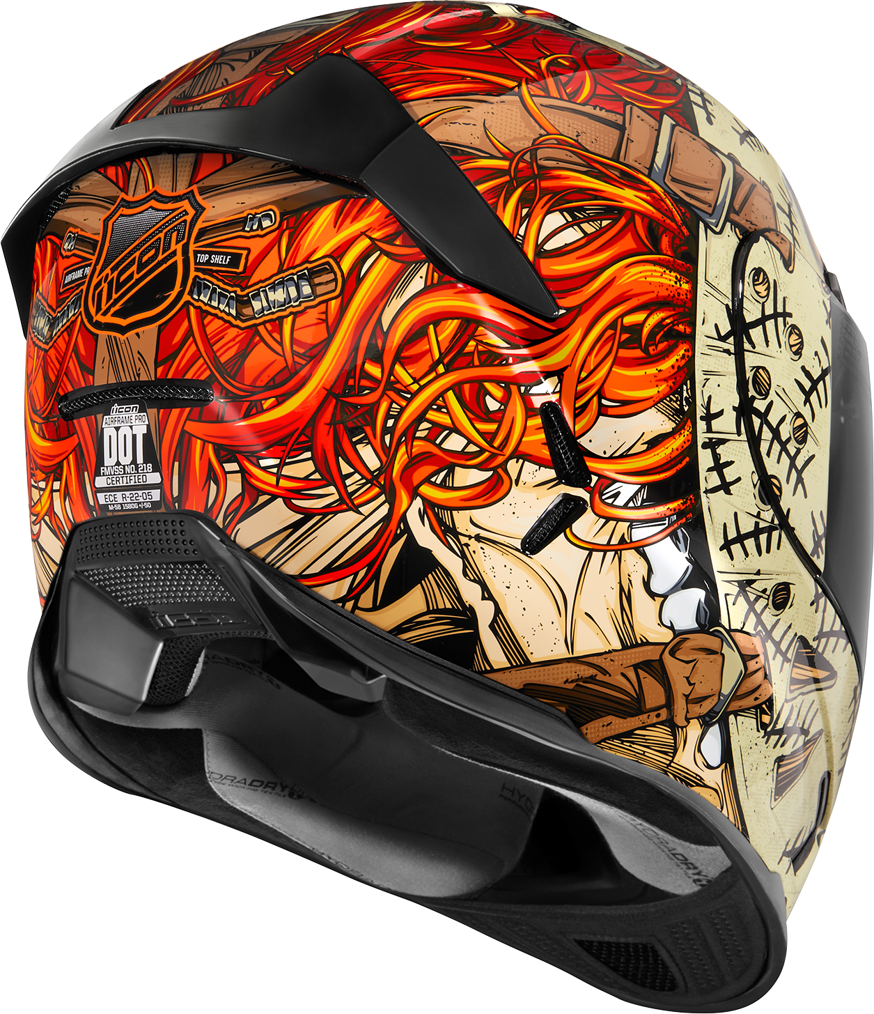 Five-piece modular liner with moisture-wicking Hydradry*, Low-profile vents throughout the shell, Prolock* positive shield locking system, Sculpted neck roll reduces jacket/suit interference, Fog-free ICON Optics* Shield with Rapid-Release* system, Linear ported forehead vents, Removable breath deflector and chin curtain, Handcrafted composite fiberglass FRP (fiber-reinforced plastic) shell, Includes Clear & Dark Smoke ICON Optics* Shield