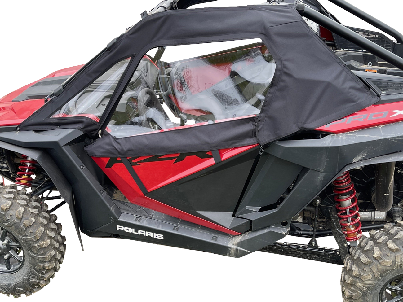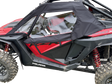 600 denier polyester shell, Automotive grade clear flexible acrylic side windshield sewn in upper section of doors, Doors are completely removable and have full length #10 double pull zippers, Installation is simple using clamps on each side of enclosure attaching to roll bars for a solid weatherproof seal, Comes complete with necessary self adhesive Velcro used on top of doors, as well as installation and care instructions, Doors can be totally removed for added ventilation on warmer days, Not a framed door kit, Made in the USA
