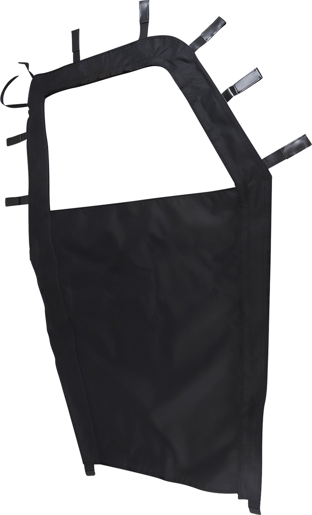 600 denier polyester shell, Automotive grade clear flexible acrylic side windshield sewn in upper section of doors, Doors are completely removable and have full length #10 double pull zippers, Installation is simple using clamps on each side of enclosure attaching to roll bars for a solid weatherproof seal, Comes complete with necessary self adhesive Velcro used on top of doors, as well as installation and care instructions, Doors can be totally removed for added ventilation on warmer days, Not a framed door kit, Made in the USA