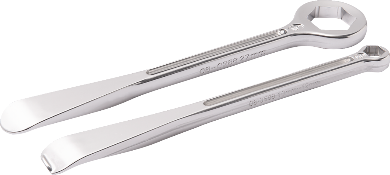 One lever has unique combination stepped 10/12 mm box end wrench on other end for turning rim lock nuts, Tire spoon with axle nut hex wrench and tire spoon hex wrench for rim lock nut set, Unique no-pinch tip on one lever helps protect inner tube during tire installation, Second wrench has hex box wrench for 27 mm axle nuts on other end, Hex ends for axle nuts are rated for a maximum torque of 90 lb/ft, Both levers have perfectly contoured tire lever on one end, Made from lightweight forged 7075-T6 aluminum, Hard anodized finish