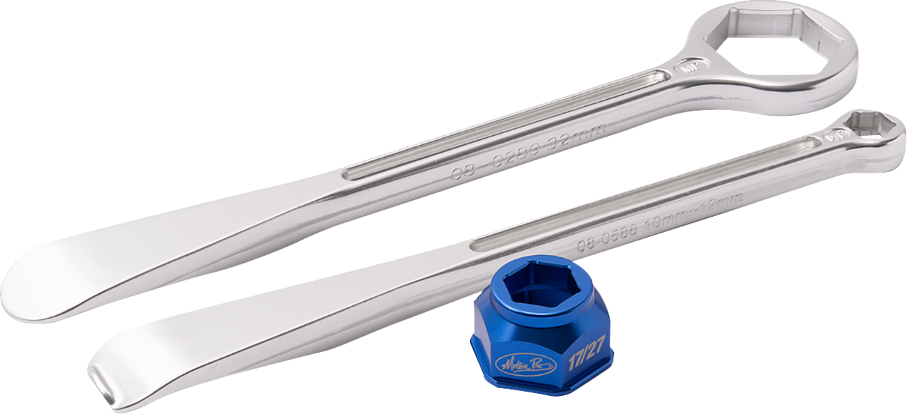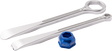 One lever has unique combination stepped 10/12 mm box end wrench on other end for rim lock nuts, Unique no-pinch tip on one lever helps protect inner tube during tire installation, Adapter is made from CNC machined aluminum for precise fit and function, Second wrench has hex box wrench for 32 mm axle nuts on other end, 32 mm hex for axle nuts is rated for a maximum torque of 90 lb/ft, Both levers have perfectly contoured tire lever on one end, Unique patented adapter allows use on 32 mm axle nuts, 10/12 mm hex is rated for a maximum torque of 50 lb/ft, Made from lightweight forged 7075-T6 aluminum, 2 tire spoon set with versatile adapter insert, Adapter weighs only 1 oz, Hard anodized finish