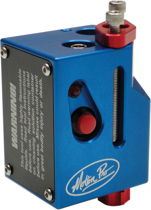 Will flush and back flush injectors for best possible cleaning process, Push button switch to turn fuel injector on with LED indicator light, Kit includes fuel injector cleaner tool, pigtail and 9V battery, Durable anodized billet aluminum construction, Built tough for everyday shop use, Easily clean most fuel injectors, No compressed air required, For best results use Motion Pro fuel injector cleaner part # 3704-0389, it's specifically formulated not to harm O-rings and other fuel injector moving parts (sold separately).