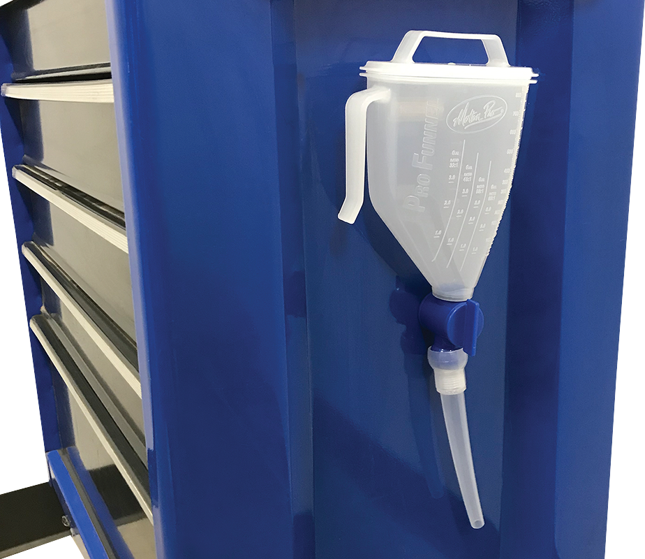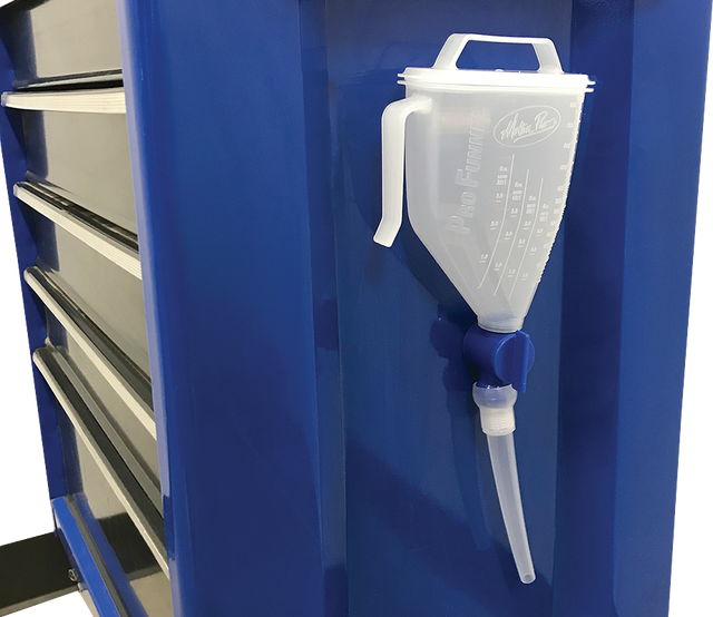 Integrated shutoff valve allows precise amount of liquid to be dispensed, Graduation marks for cubic centimeters, fluid ounces and premix ratio, 1000 cc (34 oz.) capacity, Adjustable ball-pivot spout allows easy, spill-free filling, Top cover keeps dust and dirt out when not in use, Magnet allows funnel to be stored conveniently on the side of your tool box, Large molded handle for secure grip