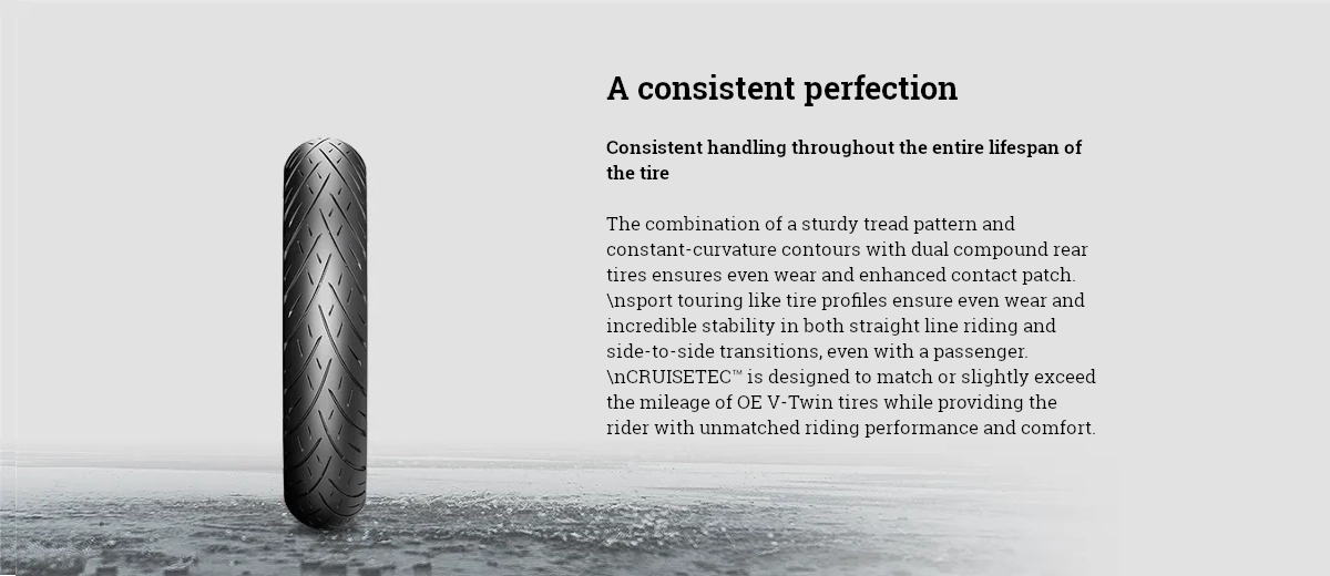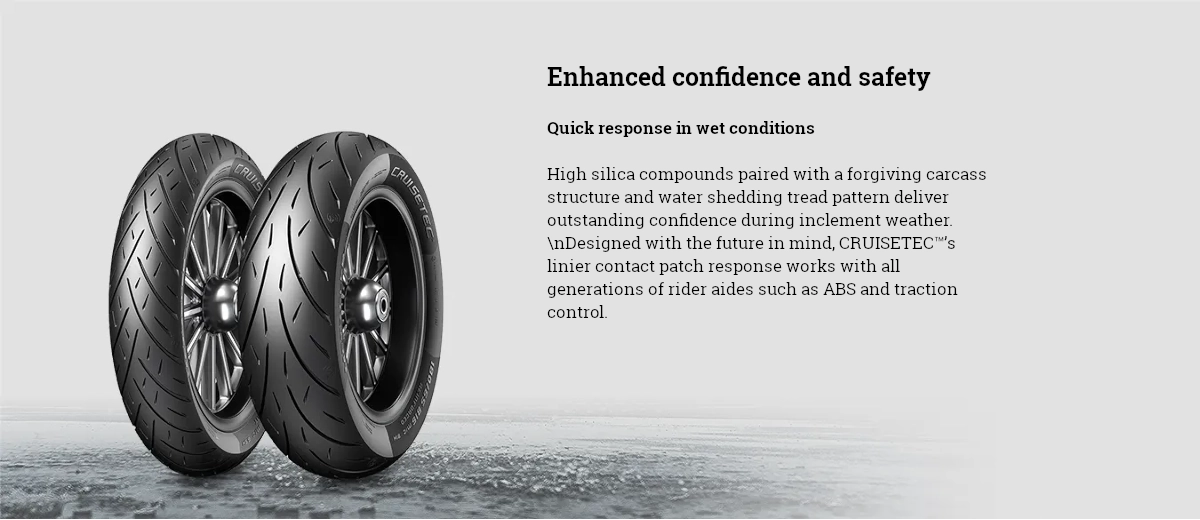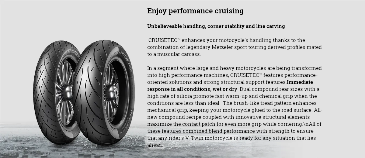 Cruisetec, a more performance-oriented tire, complements and completes the existing custom touring range for Metzeler which includes the Marathon 888, Dynamic handling with a dual compound rear providing outstanding lateral and forward grip while maintaining excellent mileage, Extended grooves within the tread pattern to improve control when leaning and water evacuation, Ideal for riders looking for the right balance between performance, versatility and personality, Enhanced tread pattern and high silica compound to promote chemical grip on wet surfaces, Perfecting performance for V-Twin bikes