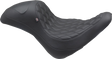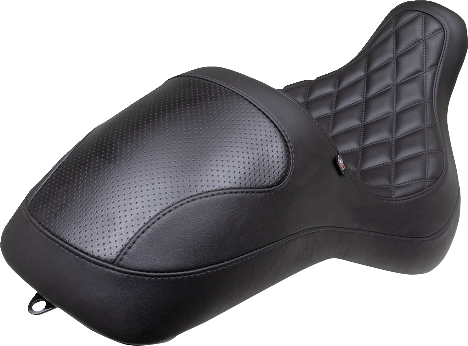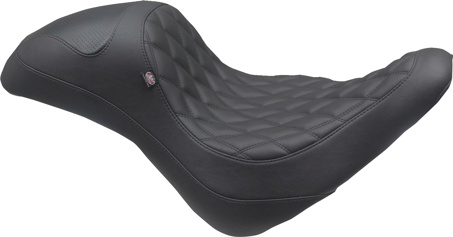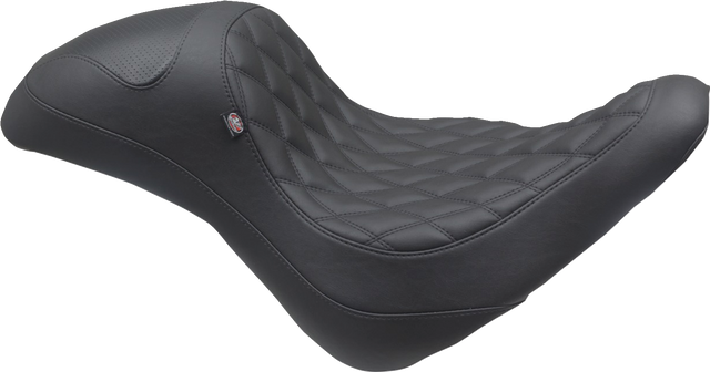 A low-cut driver bucket is paired with a tall tail section for incredible back support, while giving a mean racing-cowl look, Uniquely styled for the lines of the Fat Boy, Hand-sewn cover features a double-diamond pattern in front with a perforated-look vinyl on the 7* (17.78 cm) wide rear, 11-1/2* (29.21 cm) wide bucketed rider area provides excellent support in a low-profile and sporty package, Handsewn cover with double-diamond and perforated accents made from marine-grade expanded vinyl, Mustang*s proprietary controlled-density foam formula requires no break-in and retains shape and support after years of use, Marine-grade fiberglass baseplate for long-lasting support and durability, with polyurethane bumpers to absorb vibration, Made in U.S.A.