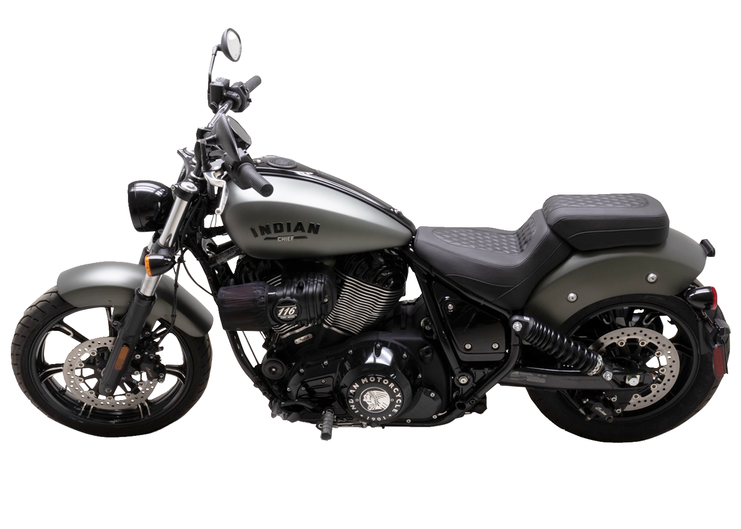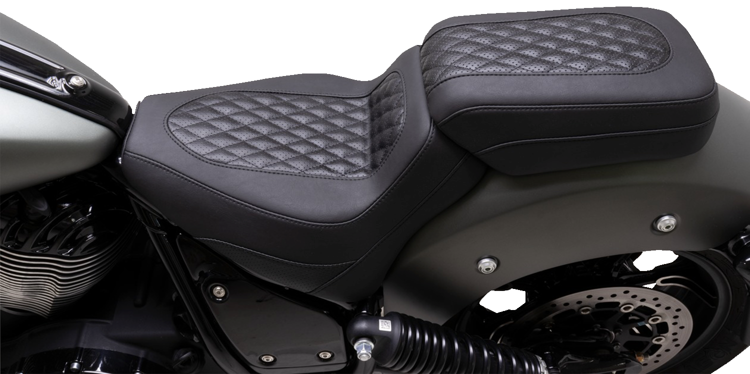Add an aggressive style and upgrade your comfort on your Chief with the Squareback* by Mustang, The solo seat has an aggressive look and a generous rise with a 10.25" wide seating area, Bucketed rider area provides excellent support and diamond-stitched perforated center panels, Places the rider at a similar reach compared to stock, 7.25" wide passenger area allows for comfortable 2-up riding if you choose to pair it with a passenger seat that overlaps the top of the solo for more driver back support, Hand sewn cover with classic single diamond stitching made from marine-grade expanded vinyl, Mustang's proprietary controlled-density foam formula requires no break-in and retains shape and support after years of use, Marine-grade fiberglass baseplate for long-lasting support and durability, with polyurethane bumpers to absorb vibration, Made in the U.S.A.