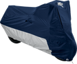 Made from a water-resistant, lighter weight, UV-treated Tri-Max? polyester, Ventilation system minimizes condensation buildup and allows constant air circulation, Silver heat-resistant lower panels, Snug elastic bottom with one-inch grommets at center and front wheel, Soft windshield liner helps protect against scratching and hazing, Packed in free compression bag for the ultimate in compact storage, Ideal for light/mild outdoor weather conditions and traveling, Use for temporary storage or in open carports or similar structures, Not intended for trailering