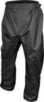 100% waterproof motorcycle pants, Soft PVC free polyester oxford with smooth PU backing, All seams are electronically taped to keep water out, Waist buckles with comfort stretch elastic for maximum adjustability, Reflective material for night visibility, Over-sized zipper-free self-fastening leg gussets for easy boot entry, Heat-resistant material to protect legs from brief contact with hot parts, Integrated reinforced seat panel to minimize slipping and add strength, Waist loops for adding optional suspenders