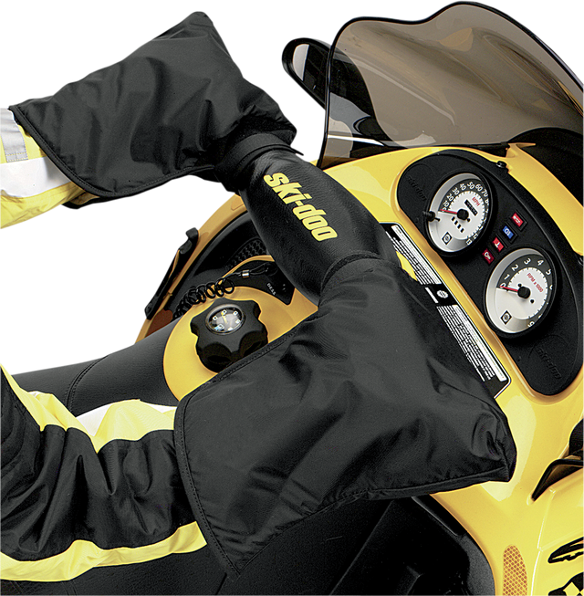 For ATVs and snowmobiles, Designed to protect your hands in the most extreme conditions, Heavy black nylon outer shell, Design allows more room for controls, Fleece lining wards off the cold, Install easily with hook-and-loop type fastener that seals around the handlebars, Measure 9-1/2" W x 13-1/2" L