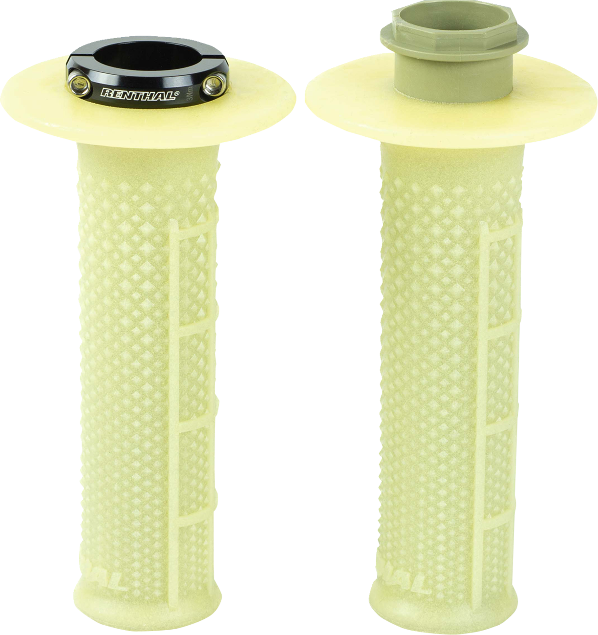 Lock-on grip is fit for installation on any aftermarket handlebar without the need for modification while retaining full clamping force, Twin split collar design means you are able to slide the clutch side grip over any knurled MX handlebars without any sanding or modification, ensuring the clamp is permanently bonded to the grip, Each pair of grips comes with a set of 6 throttle cams; cams cleanly snap on with a simple press fitment design and provide smooth throttle action, Tuff-End Tech provides 4 mm thick solid plastic end caps with a premium and vibrant Renthal *R* logo to minimize damage that can incur during a crash or tip over, allowing you to finish your ride or race without failure, Will work with any existing ODI cam; see Renthal website for additional fitment-related information.