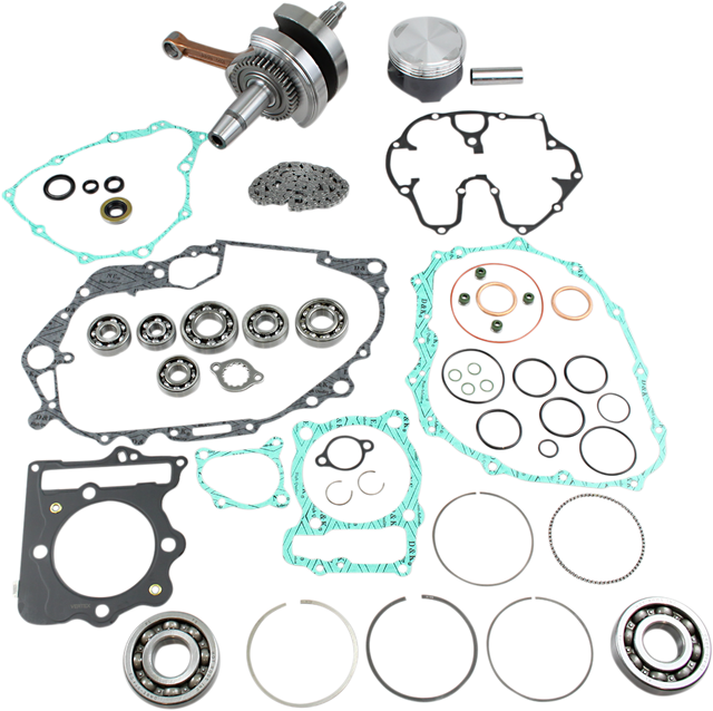 Complete engine rebuild kit, Includes crankshaft, piston kit, complete engine gasket kit with oil seals, main bearings and seals, water pump rebuild kit, transmission bearings, countershaft bushing/seal kit, cam chain and counter balancer bearings when applicable
