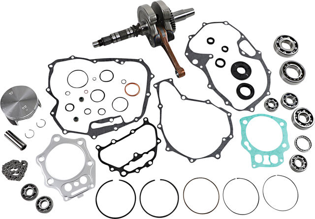 Complete engine rebuild kit, Includes crankshaft, piston kit, complete engine gasket kit with oil seals, main bearings and seals, water pump rebuild kit, transmission bearings, countershaft bushing/seal kit, cam chain and counter balancer bearings when applicable