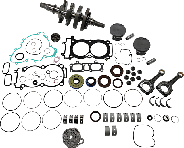 Complete engine rebuild kit, Includes crankshaft, piston kit, complete engine gasket kit with oil seals, main bearings and seals, water pump rebuild kit, transmission bearings, countershaft bushing/seal kit, cam chain and counter balancer bearings when applicable