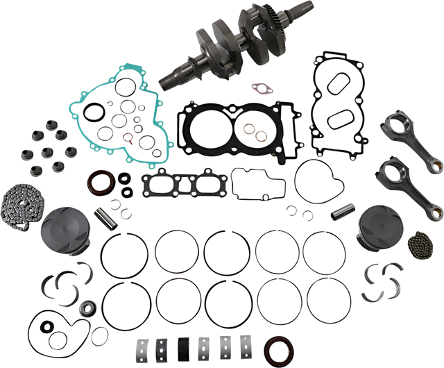 Complete engine rebuild kit, Includes crankshaft, piston kit, complete engine gasket kit with oil seals, main bearings and seals, water pump rebuild kit, transmission bearings, countershaft bushing/seal kit, cam chain and counter balancer bearings when applicable