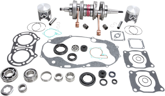 Convenient one-stop shop in a box; nearly all components required for a complete and professional rebuild, Vertex piston kit (standard compression piston, rings, pin and clips), Hot Rods heavy-duty crank (stock stroke with wrist pin bearing), Hot Rods main bearing/seal kit, Hot Rods transmission bearing kit (includes transmission bearings, output shaft collar and sprocket lock washer), Hot Rods counter balancer bearing kit, Hot Rods water pump bearing and seal kit, Vertex complete gaskets kit, including seals and O-ring kit (covers top and bottom)