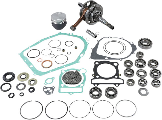 Complete engine rebuild kit, Includes crankshaft, piston kit, complete engine gasket kit with oil seals, main bearings and seals, water pump rebuild kit, transmission bearings, countershaft bushing/seal kit, cam chain and counter balancer bearings when applicable