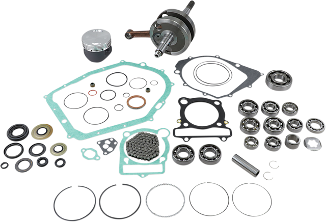 Complete engine rebuild kit, Includes crankshaft, piston kit, complete engine gasket kit with oil seals, main bearings and seals, water pump rebuild kit, transmission bearings, countershaft bushing/seal kit, cam chain and counter balancer bearings when applicable