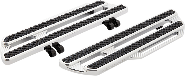 CNC-machined billet floorboard bodies, Vibration isolating footrests offer enhanced foot traction through Airtrax style rubber tops that feature a proprietary internal structure engineered specifically to absorb vibration associated with V-twin engines , AirTrax style shift pegs and footpegs are available separately for matching passenger footrests and control arm pegs, Extended length for added comfort and more foot room, 18" long x 5-3/4" wide x 1" thick, Featuring Arlen Ness laser logo, Sold in pairs