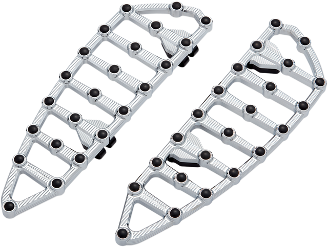 MX floorboards feature a detailed cut through design with integrated rubber inserts for excellent foot traction, CNC machined from a solid block of billet aluminum, Rubber inserts offer foot traction and protect the finish of the aluminum floorboard, replaceable, Extended length for added foot room and comfort, Models with passenger footpegs will require the use of OEM accessory floorboard mounts.