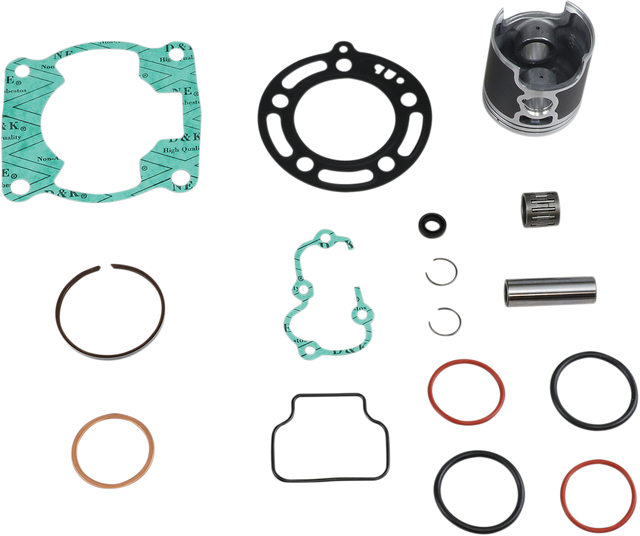 The piston is heat treated with a T-5 hardening and tempering cycle, The piston skirt is coated with a high-tech Molybdenum Disulphite coating for faster break-in time and increased piston life, Gravity-cast aluminum alloy (not forged) with 18% silicone content, Cast OE replacement piston, Top end kit includes piston, rings, pins, circlips, top end gaskets, and wrist pin bearing